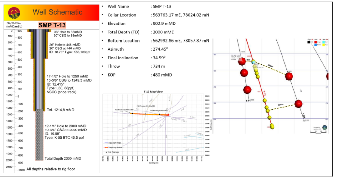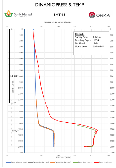 2023年6月7日,SMGP钻井和资源团队对耗时27天、于6月6日完井的T-13井进行了完井测试。测试数据显示:T-13是一口高温、高流动性的生产井,成功打出了因T-11修井失败而损失的热源。该井吸水指数在54.76kg/s/bar到94.12kg/s/bar之间,在停止注水后4.5小时后井下最高温度即录得217.9℃。其生产层稳定在300℃的情况下,该井预计可生产190吨/小时的高压蒸汽。